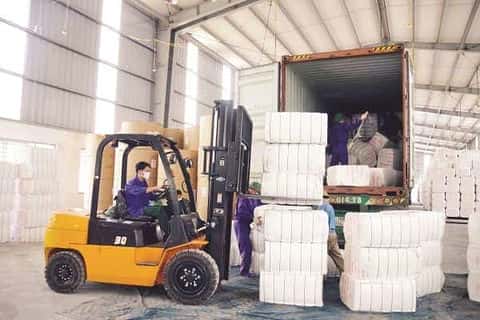 Nhập bông vào kho bảo quản.  Ảnh: HỒNG HẠNH