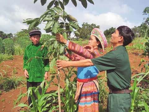 Cán bộ Trung đoàn 720 hướng dẫn đồng bào chăm sóc cây cao su.
