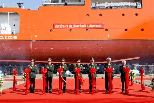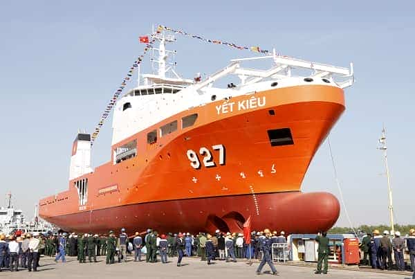 Quang cảnh hạ thủy tàu tìm kiếm, cứu nạn tàu ngầm đa năng 927-Yết Kiêu.