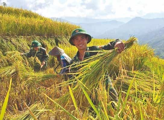 Bộ đội biên phòng gặt lúa giúp dân.