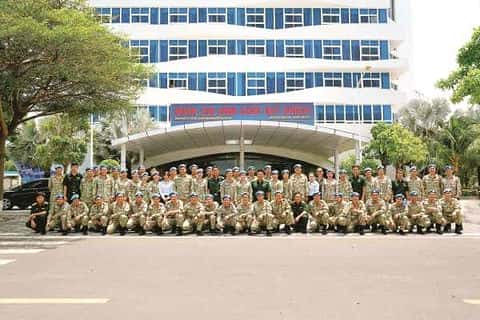 Lực lượng Gìn giữ hòa bình Việt Nam chụp ảnh lưu niệm cùng cán bộ, nhân viên Đoàn 298.    Ảnh: CTV