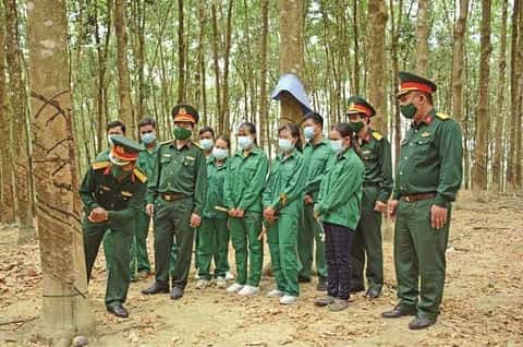 Cán bộ Đoàn KT-QP 78 (thuộc Binh đoàn 15) hướng dẫn kỹ thuật cạo mủ cao su cho người lao động của thôn 4, xã Ia Dom, huyện Ia H’Drai, tỉnh Kon Tum.