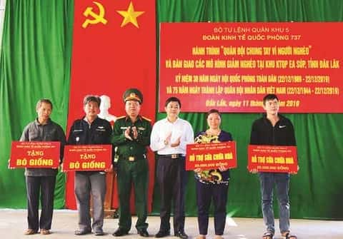 Đến hai xã vùng biên Ia R’vê và Ia Lốp của huyện Ea Súp, chúng tôi được mắt thấy, tai nghe nhiều việc làm nghĩa tình của cán bộ, chiến sĩ, người lao động Đoàn KT-QP 737 trong hành trình “Chung tay vì người nghèo”. Thời gian qua, Đoàn duy trì 106 mô hình giúp dân giảm nghèo, như: tặng bò giống, heo rừng lai, vịt trời, xoài tứ quý, mít Thái siêu sớm… với tổng trị giá 2,2 tỷ đồng; triển khai dự án trồng thử nghiệm cây ca cao, chuối, sắn với diện tích 786 héc-ta, tạo việc làm thường xuyên cho 162 hộ dân; đóng góp gần 100 triệu đồng xây dựng công trình “Đoàn kết quân - dân”. Đoàn phối hợp với trạm khuyến nông huyện, xã tổ chức 20 lớp tập huấn về kỹ thuật chăn nuôi vịt trời, dê, bò sinh sản, thương phẩm và trồng, chăm sóc cây ăn quả cho hơn 600 hộ dân. Chị Nguyễn Thị Hưng ở thôn 1, xã Ia R’vê phấn khởi cho biết: “Nhờ Đoàn 737 mà gia đình tôi được hỗ trợ một cặp bò giống trị giá 30 triệu đồng. Đây là tài sản rất lớn và đáng quý với gia đình. Gia đình sẽ cố gắng chăn nuôi thật tốt để tăng thu nhập, vươn lên ổn định cuộc sống”.