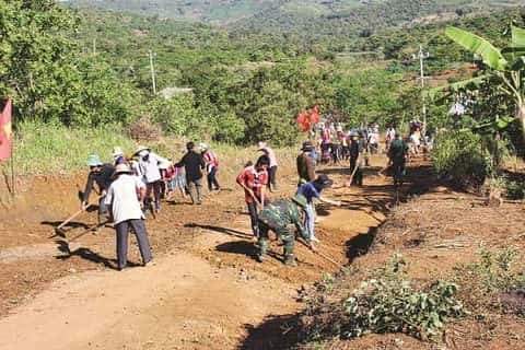Đoàn viên Binh đoàn 16 giúp nhân dân địa phương tu sửa đường giao thông.    Ảnh: QUANG SÁNG
