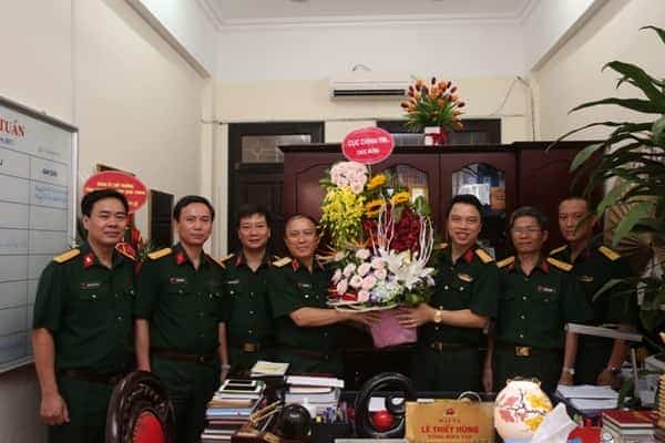 Thiếu tướng Lâm Trọng Đông, Chủ nhiệm Chính trị Tổng cục CNQP, cùng các cán bộ Cục Chính trị, chúc mừng Tạp chí.