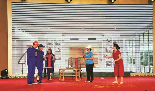 Phần thi năng khiếu của thí sinh Nguyễn Thị Hường (thứ hai từ phải sang), Chủ tịch Công đoàn cơ sở Nhà máy Z129.   Ảnh: LAM THU
