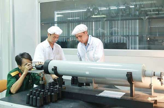 Cán bộ, kỹ sư Xí nghiệp Quang điện 23 (Nhà máy Z199) hiệu chỉnh các loại kính ngắm trước khi bàn giao.