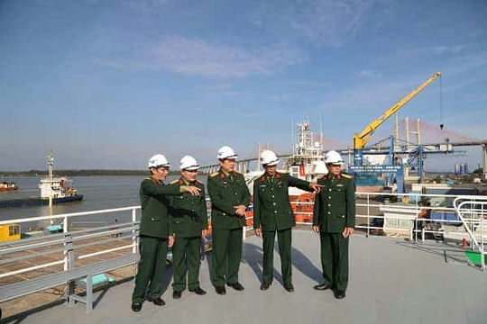 Đại tá Nguyễn Việt Hùng, Phó Chính uỷ Tổng cục CNQP (đứng giữa), thăm khu vực cầu cảng của Nhà máy.
