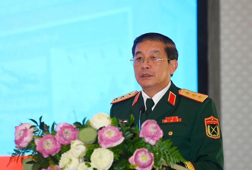 Thượng tướng Trương Thiên Tô, Phó Chủ nhiệm Tổng cục Chính trị Quân đội nhân dân Việt Nam, phát biểu tại hội nghị.