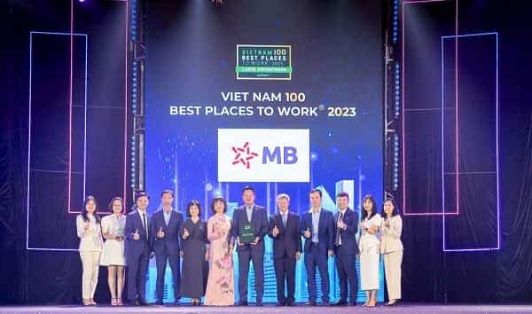 Đại diện MB nhận giải thưởng “Nơi làm việc tốt nhất Việt Nam” năm 2023.