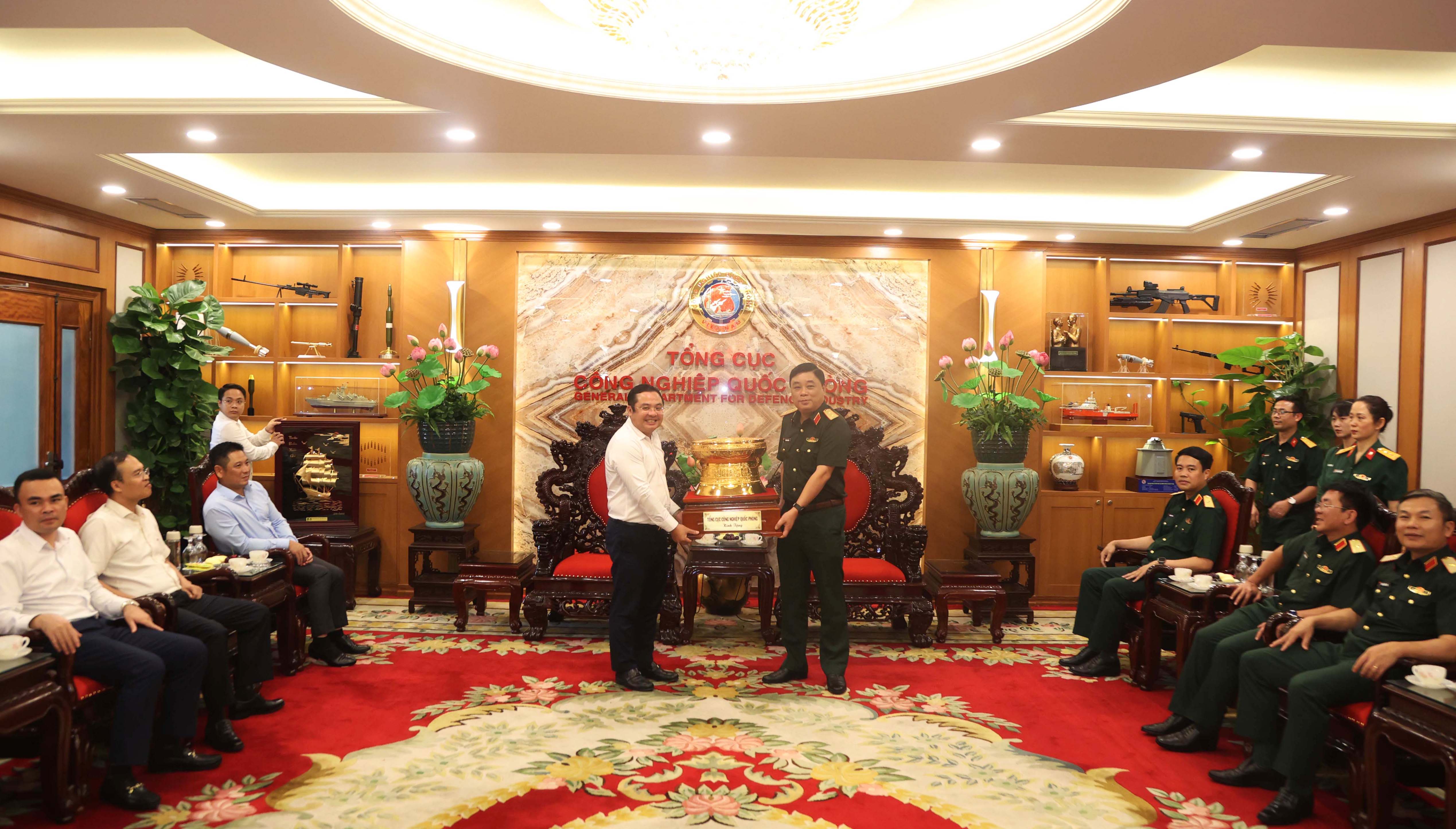 Trung tướng Hồ Quang Tuấn, Chủ nhiệm Tổng cục CNQP, trao quà của Tổng cục tặng Tập đoàn VINACHEM.