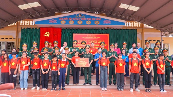 Thủ trưởng Tổng cục CNQP trao quà tặng học sinh Trường THCS Hóa Thượng (tỉnh Thái Nguyên).