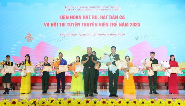 Thiếu tướng Nguyễn Việt Hùng, Phó Chính ủy Tổng cục CNQP, trao giải Xuất sắc Liên hoan hát ru, hát dân ca tặng Nhà máy Z111.