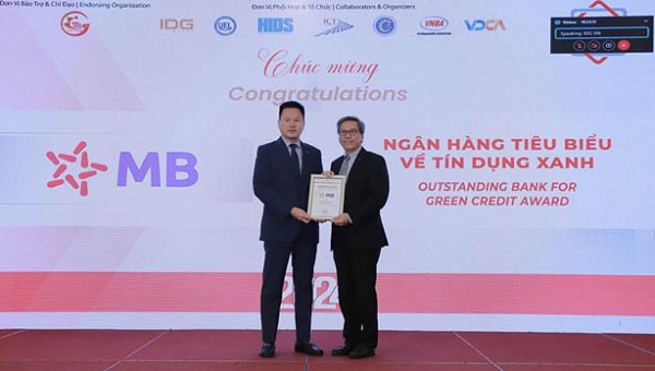 Ông Hà Trọng Khiêm - Phó Tổng giám đốc MB (bên trái), đại diện ngân hàng, nhận giải thưởng “Ngân hàng tiêu biểu về tín dụng xanh”.